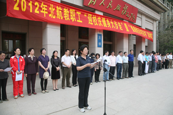 纪委书记、工会主席纪素菊为活动致辞,她指出,大力开展群众体育工作,是实践科学发展观,促进和谐校园文化建设的充分体现;不断提高师生的健康素质,是我校群体工作的根本目标,是促进师生全面发展的重要教育手段。我校开展健身大步走活动已是第四年,四年来全校各院系领导、部处领导带头示范,师生员工积极参加,每年都有千余人参加此项活动,取得了显著的成效。希望广大教职工以此活动为契机,坚持从我做起,积极参与、共享健康,以饱满的精神和健康的体魄努力工作、快乐生活,努力为北航贡献一份力量,以昂扬的精神喜迎甲子校庆,以优秀的工作成绩贡献于学校的建设和发展。